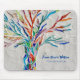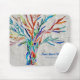 This decorative mouse pad features a print of a rainbow colored tree on a pale gray background.
