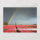 Postcard of a colourful rainbow in a dark sky over a windmill and a field full of bright red tulips during a spring storm in a landscape near Amsterdam in the Netherlands with a fading bar and the text: 'Netherlands'.