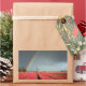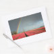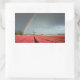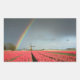 Rectangular photo sticker with a colourful rainbow in a dark sky over a windmill and a field full of bright red tulips during a spring storm in a landscape near Amsterdam in the Netherlands.