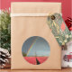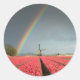 Round photo sticker of a colourful rainbow in a dark sky over a windmill and a field full of bright red tulips during a spring storm in a landscape near Amsterdam in the Netherlands.