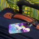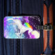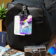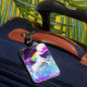 A luggage tag featuring a rainbow unicorn.