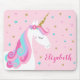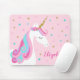 This mouse pad features a cute whimsical unicorn design with stars and faux gold glitter on a pastel pink background. Personalize it with a name.