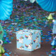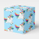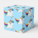 Party favour box shown in a light blue colour with a cute cartoon rainbow unicorn print.