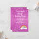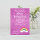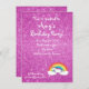 Birthday invitation template with unicorn on rainbow and clouds with faux pink glitter background