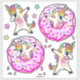 Cute and fun dancing Unicorns with rainbow hair doing the dab dance pose. Two unicorns popping out of Pink cartoon Iced Doughnuts with confetti stars and sprinkles.