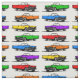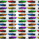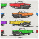 This fun and vibrant illustration features a pattern of 1950s sports cars in a rainbow of colors.
