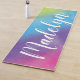 Modern vibrant coloured custom yoga exercise mat design features a diagonal rainbow watercolor gradient / tie dye style background with modern white script overlay text that can be personalised with your name or other wording. Colours include hot pink, violet purple, cyan blue, and lime green.