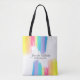 Beautiful watercolor rainbow custom bridal party tote bags with pretty, artistic paint strokes full of bright colour. This colourful personalised gift is perfect for your maid of honour and bridesmaids.