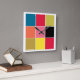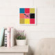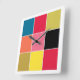 It’s a square wall clock inspired by artwork painted by Granddaughter Gigi. She loves the blue sky, the two suns and her pink version of a rainbow waterfall with black spots. Grandma Celeste created the mix and match squares pattern.