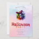 The typography is equally playful and stylish. A mix of curved black handwriting at the top and a plain black block font for the majority of the text keeps things easy to read while adding a touch of personality. The word "Halloween" in a burgundy red distressed font brings a bold and festive touch, while "party" in orange block font adds a pop of excitement. The back of the invitation features the same dreamy background, tying the whole design together in a cohesive and beautiful way.