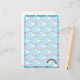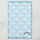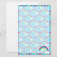 A colourful pattern of rainbows, hearts, and stars, are on a blue background with light blue polka dots.