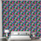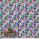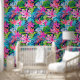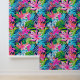 This wallpaper is a vibrant tapestry of tropical flora, featuring an intricate pattern of lush leaves and exotic flowers in shades of pink, blue, and green. The design is symmetrical and repeats throughout, creating a continuous natural motif that evokes the dense foliage of a rainforest. The bright pink flowers stand out against the cooler tones of the leaves, making it visually stimulating.