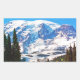 A view of Mount Rainier through a break in a grouping of pine trees.