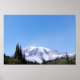 A view of Mount Rainier peaking above a rolling green hill with trees.