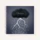 A whimsical dark thunder cloud spews rain and lightning illuminating a pool of rippling water. Customise the cloud with a name or title for your notebook.