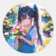Serene art of a cute girl holding a bouquet of colourful flowers in a gentle rain shower surrounded by blossoms. A touch of peaceful beauty.