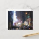 Capture the captivating energy of New York City under a soft, misty rain on a dark evening. The card’s front shows a bustling NYC street scene at night, with iconic yellow taxis reflecting in shimmering puddles on wet asphalt. Skyscrapers loom above, their lights blurred into a vibrant glow by the drizzle. Umbrella-clad pedestrians weave through crosswalks, adding a hint of romance to the moody, atmospheric setting.