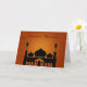Ramadan card with mosque and crescent moon with star against gold and orange patterned background.