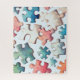 Discover a playful design with random shapes, sizes, and colours of puzzle pieces whimsically scattered in a watercolor style against a light blue backdrop. Engage them with this charming jigsaw puzzle.