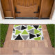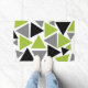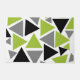 An abstract geometric design featuring lime green, medium grey, and black triangles randomly arranged on a white background.