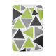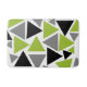 This bath mat features a modern abstract geometric design of lime green, medium grey, and black triangles randomly arranged on a white background.