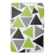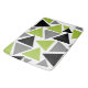 This bath mat features a modern abstract geometric design of lime green, medium grey, and black triangles randomly arranged on a white background.