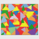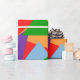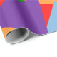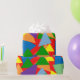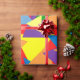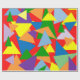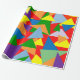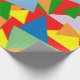 This wrapping paper has a red background with random multi-coloured triangles covering it.