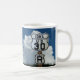 Photograph of a rare 1920s US Route 30, Iowa, Lincoln Highway sign with an "R" sign below indicating a right turn (later replaced with arrows). Background image added to enhance photo. Design on both sides of mug.