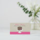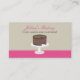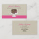 A simple business card featuring an illustration of a chocolate layer cake with raspberry filling on a white cake stand. Text is brown and pink. Customise the front with business name and short description. Personalise the brown text on back with your name, job title, and contact information.