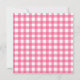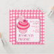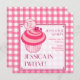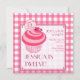 A birthday party invitation featuring a background of pink gingham on front and back. Front features an illustration of a raspberry cupcake at top left. Customise the number on the cupcake topper. Personalise the text underneath and to the right of the cupcake with details of your occasion. Text surrounded by pink frame.