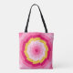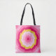 This image is a vibrant, geometric spiral design featuring concentric jagged-edged rings in shades of pink, magenta, and yellow, radiating from the centre in a kaleidoscope-like pattern. The repeating shapes and energetic colour contrasts give it a playful, retro, and visually dynamic feel that evokes both sunrise warmth and bubblegum sweetness