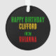 Rasta flag coloured striped Christmas tree ornament with black tropical palm tree silhouettes. All text on the back is customisable, so you can add your own names and message