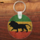 This keychain features the black silhouette of the majestic Lion of Judah on a distressed green, yellow, and red Rasta flag background.