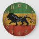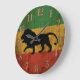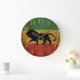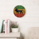 This wall clock features the black silhouette of the majestic Lion of Judah on a distressed green, yellow, and red Rasta flag background.