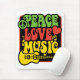 Retro-style type design of Peace, Love and Music with peace symbol, heart, guitar and musical notes in reggae colours.