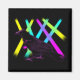 A raven standing and facing left, holding a magenta glowstick with its wing, in front of several colorful glowing spotlight beams.
