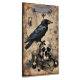 A raven is perched on a skull resting on a stack of books, surrounded by candles. Arcane symbols and illegible text on old, grungey parchment completes the illustration from a book of spells. Gothic, haunting, and perfect for those who walk on the darker side.