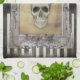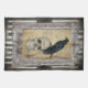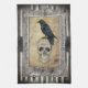A dark gothic halloween image featuring a beautiful raven, placed in a vintage frame on a back ground of black and white stripes dressed with a grunge texture. © WickedlyLovely