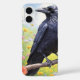 This image features a raven sitting on a branch with a field of colourful wildflowers in the background.