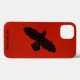 A simple, black silhouette of a Raven (Corvus corax) on a red, leather-look background image. The raven image has been given a slight "rough" or "worn" effect. Add your own text.