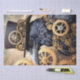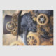 Tissue paper features digital artwork of a raven, steampunk style. The intelligent black bird is wearing a top hat decorated with gears and cogs against a background of the same (steampunk aesthetic).
