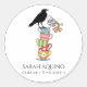 Children's book author promotional stickers featuring a raven perched on whimsical tea cups and spilling the contents. Add your initials to the tea cup.