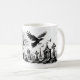 A haunting black and white illustration of a graveyard at night. A large raven soars above a field of tombstones and crosses, its wings outstretched in a menacing pose. A barren tree stands nearby, casting long, ominous shadows. The scene is filled with a sense of darkness, death, and the supernatural.