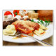 Thee cheese ravioli with parmesean cheese sprinkled on top, small meatballs on the side. Fresh vegetables, cheese and bread in the background.