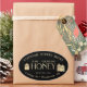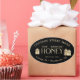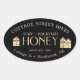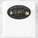 This oval "Raw Backyard Honey" label is for backyard beekeepers. "Honey" is written with an 'embossed' font in a light-coloured metallic gold gradient with three hives on a black background. Add your apiary name, honey net weight, and location.
