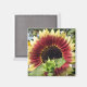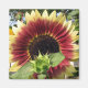 A red bicolor sunflower (Helianthus annuus) in full bloom with a sunflower bud. This variety, Razzmatazz, is a blend of reds, red bicolors, and whites.