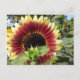 A red bicolor sunflower (Helianthus annuus) in full bloom with a sunflower bud. This variety, Razzmatazz, is a blend of reds, red bicolors, and whites.