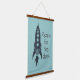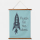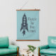 Kids' roo wall tapestry features " Reach for the stars" - motivational quote with retro style spaceship silhouette on blue background