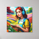 Immerse yourself in the vibrant world of this Colourful Landscape Digital Art featuring a reading girl with headphones. A captivating blend of art and technology, perfect for adding a splash of colour to any space.
