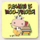 A black and white cow relaxes with a stack of books as he reads on Reading is Moo-Velous T-shirts, mugs, cards, stickers, bags, magnets, keychains, journals, pillows, and other apparel and gift items that promote reading. Great for book worms of any age!